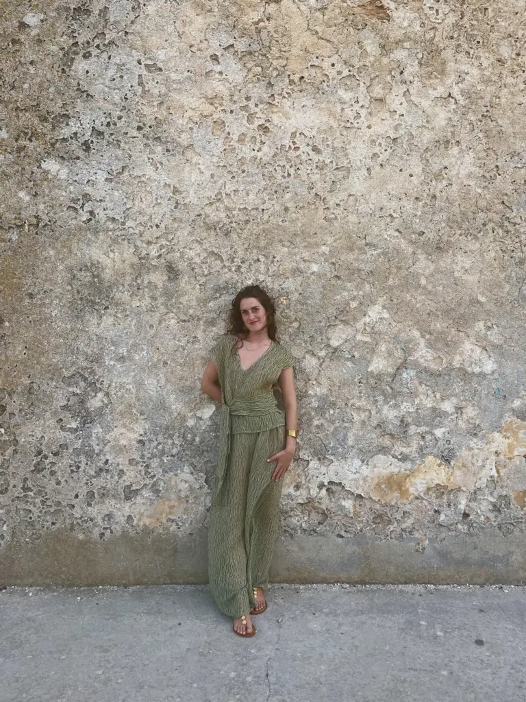Step into summer with this unique two pieces set, handmade from lightweight embroidered cotton and finished with playful tassel details. The set includes: cropped top, sleeveless, V neck, fully lined and finished with a button and loop closure at the…