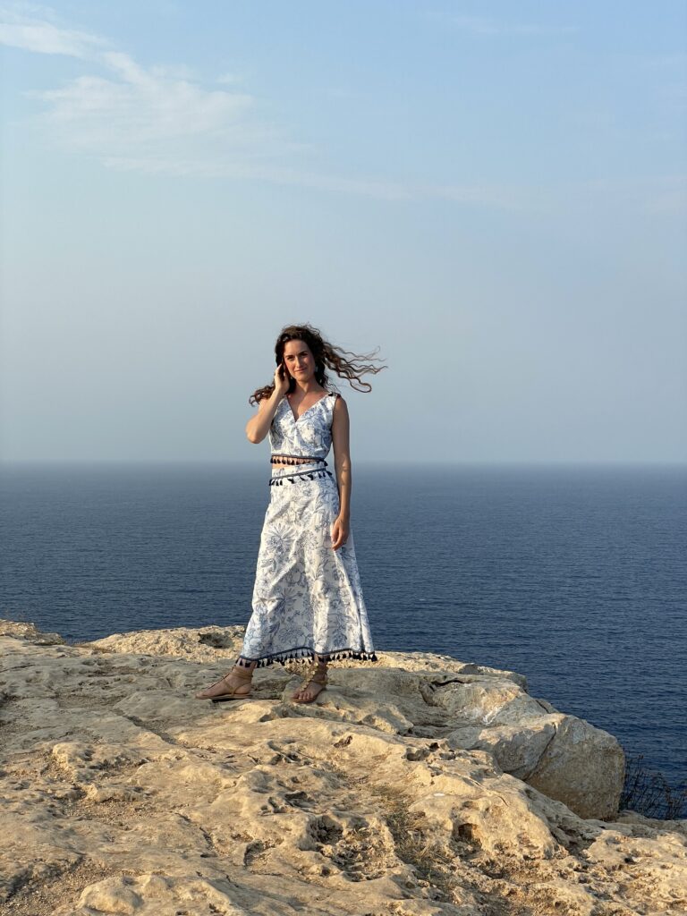 The set includes: cropped top, sleeveless, V neck, fully lined and finished with a button and loop closure at the back for an elegant artisanal touch. Midi skirt, high waisted with tassels trim along the waistband and hem for a bohemian finishing detail. Crafted in a blue on white floral embroidered fabric, this outfit blends comfort with elegance. Perfect for holiday, seaside evenings, garden parties or warm summer days.