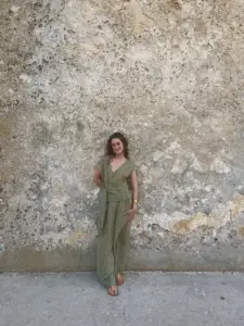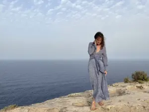 The Sunset Dress is a distinctive piece crafted from Turkish linen and cotton, adorned with a captivating orange color that imparts a mystical charm to the garment. The lightweight, semi-sheer fabric ensures a flowing and comfortable feel. The unique belt, made from a cord ruched into 5 meters of fabric stripes, adds an adjustable and customizable touch. The open back enhances feminine sensuality, and the elegant shape makes it perfect for both daytime and evening summer occasions.